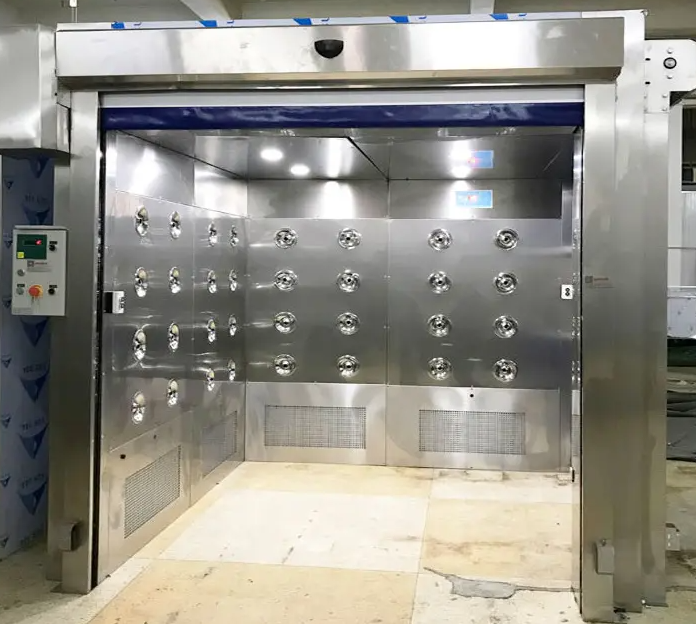 貨淋室是貨物進(jìn)入潔凈室所必須通道,起到氣閥室密閉潔凈室的作用。降低貨物進(jìn)出潔凈區(qū)所帶來的污染問題。在吹淋時(shí)由系統(tǒng)提示讓貨物有秩序的完成整個(gè)吹淋除塵過程。
